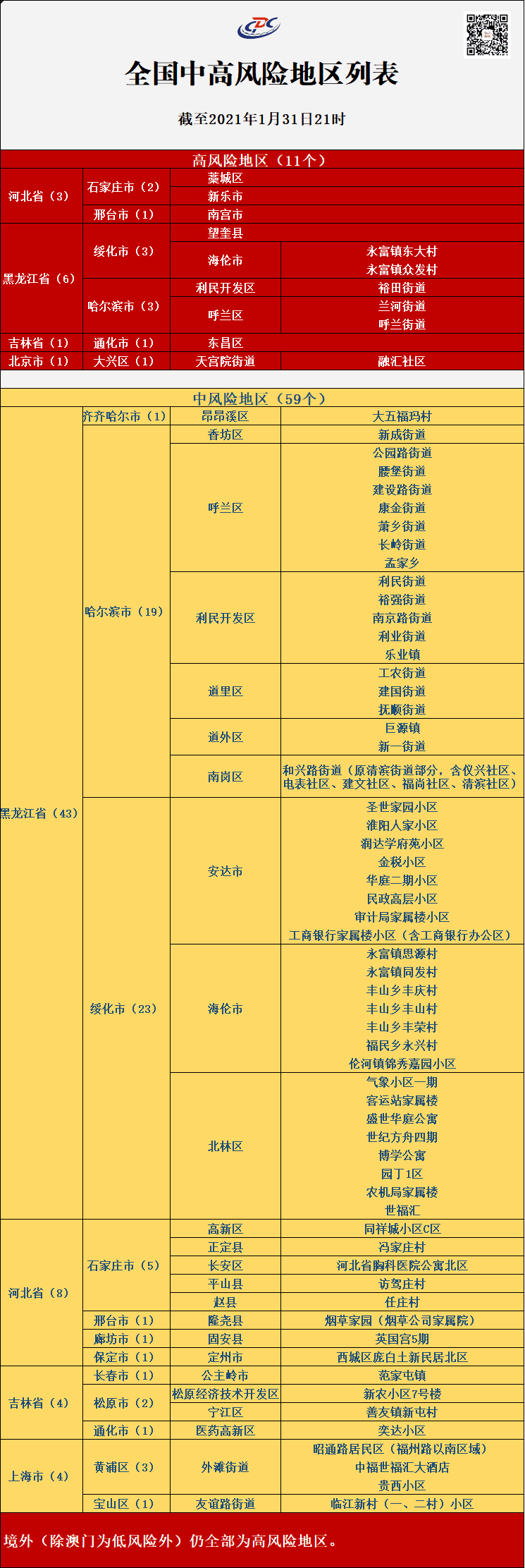 至2021年1月31日21时,全国各县区疫情风险等级情况如下:全国有11个高风险地区,59个中风险地区: